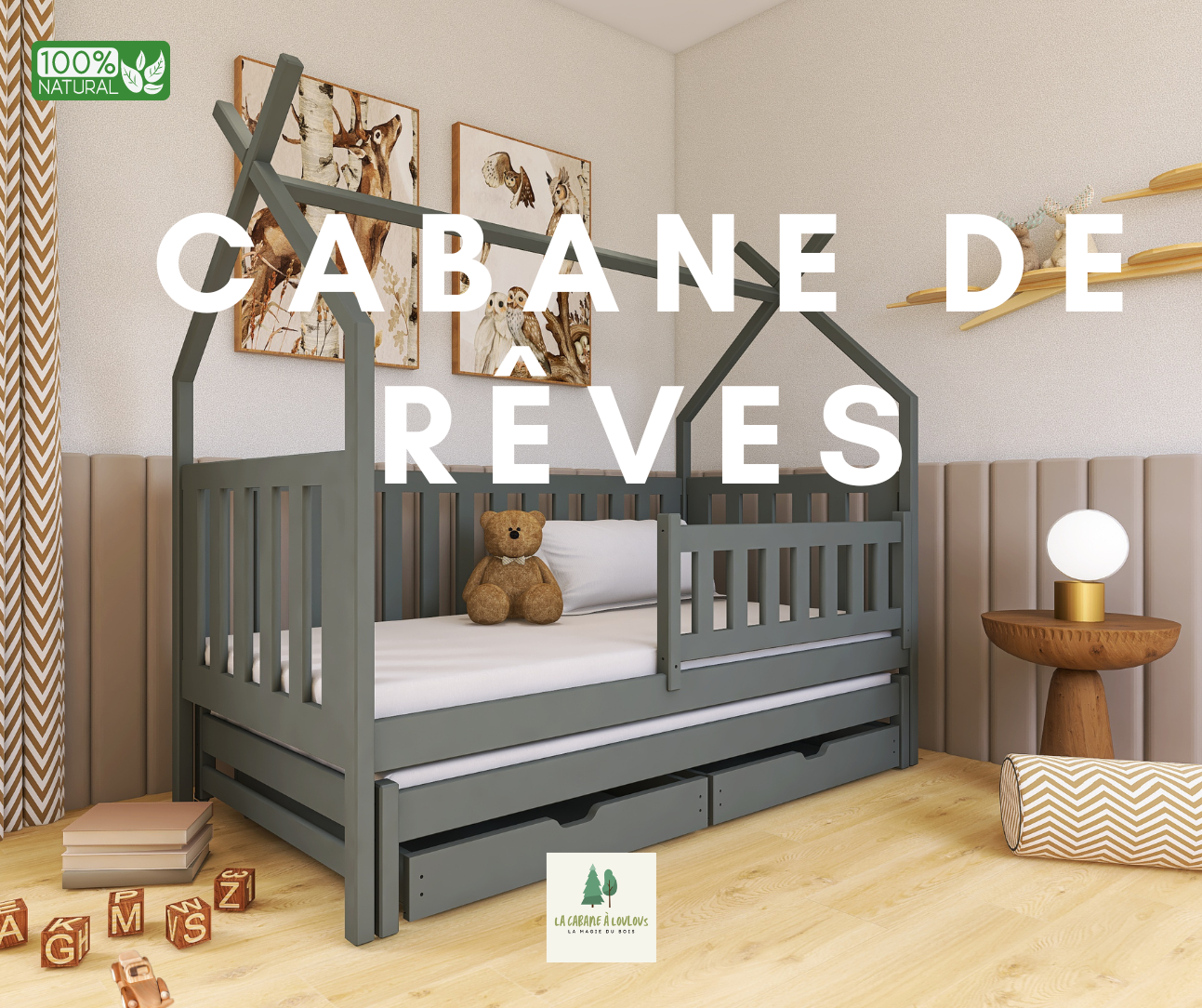 Et en mars 2024 nous lançons notre univers des Lits Cabane. Nous sommes fiers de nos lits Cabane en Pin qui sont fabriqués dans nos standards avec notre engagements Cabane.