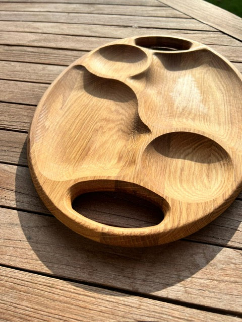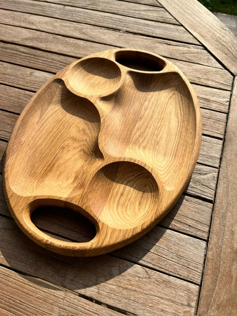 Ce plateau en bois ovale avec compartiments est un accessoire à la fois pratique et esthétique, souvent utilisé pour proposer differents produits pour les invités.